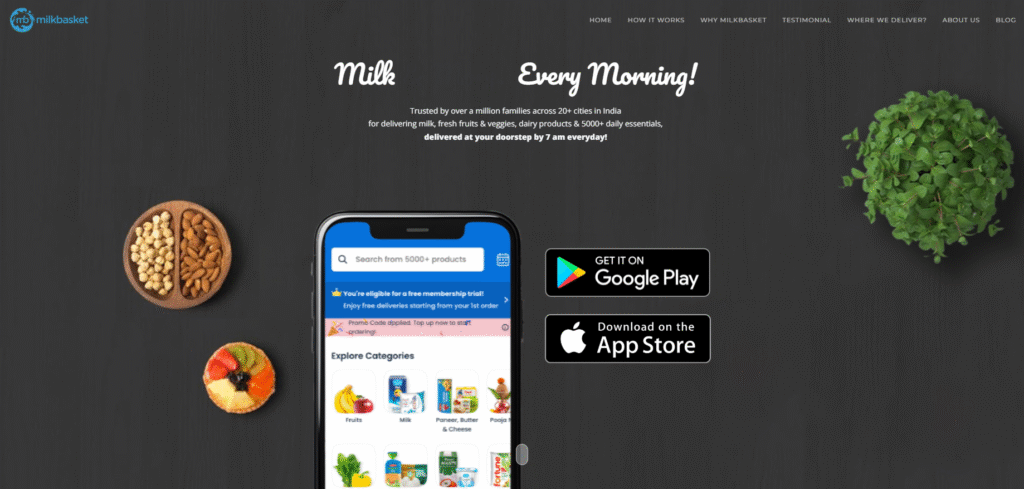 Milkbasket is one of the most convenient ultra-fresh grocery delivery platforms in India, offering silent 5 AM–7 AM morning deliveries at your doorstep.